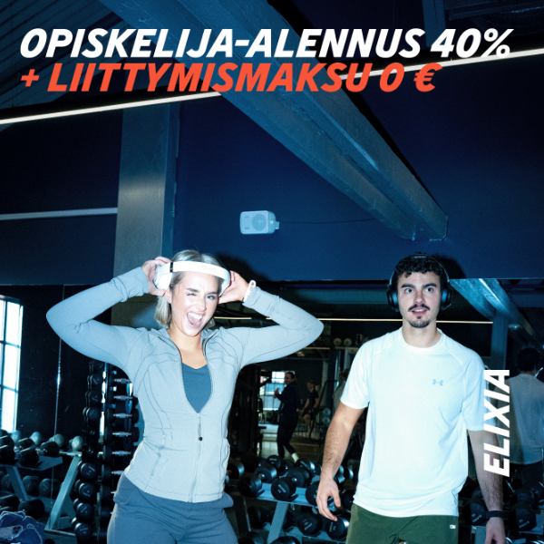 Tarjous koskee uusia 12 kk opiskelijajäsenyyksiä ja on voimassa 31.1.2026 saakka. Ei liittymismaksua (norm. 29 €). Oikeus opiskelija-alennukseen esitettävä. Ei voi yhdistää muihin tarjouksiin tai kampanjoihin.