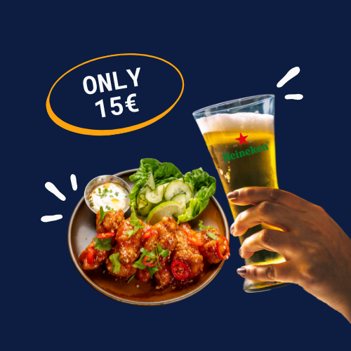9 pcs wings/ 200 g boneless chicken (+1€) with a sauce of your choice (not Hot/fluffy buffalo) & Heineken 0.5 l.