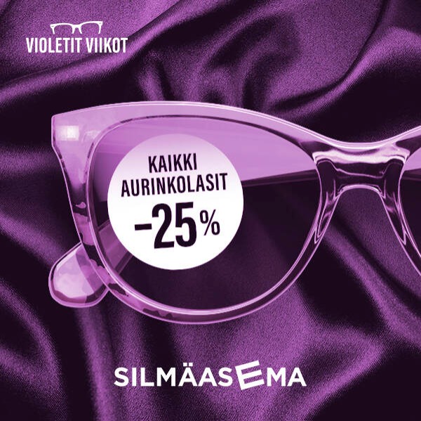 Silmäasemalla Violettien viikkojen kunniaksi kaikki aurinkolasit voimakkuuksilla tai ilman 25 prosentin alennuksella. Tervetuloa – myymälä on täynnä huipputarjouksia!