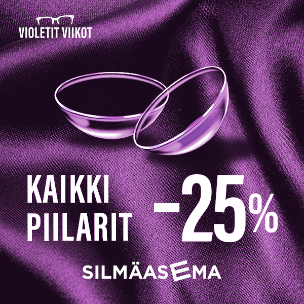 Silmäasemalla Violettien viikkojen kunniaksi kaikki piilolinssit 25 prosentin alennuksella. Tervetuloa – myymälä on täynnä huipputarjouksia!